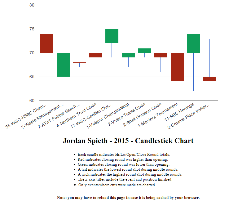 Selecting the players chart view opens a new window with a candlestick chart. This chart details the low/high/open/close trend for a players 4 day event. It can be used to identify a players overall round performance trend for starting and finishing.