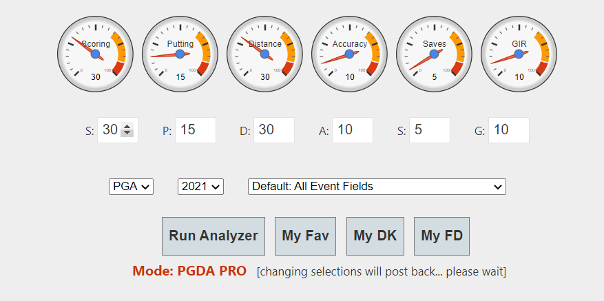 The Free dashboard enables running predictor analysis on any specific past event, all events for the current season. The Pro dashboard enables running analysis for upcoming event fields which are posted on Monday at the begining of the event week.