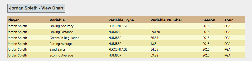 The formula inputs are customizable. Inputs are grouped as Player Skill Factors (PSFs). You decide the weights of importance for each PSF value. The PGDA tool will process the weighted skill factors as inputs and display the analyzed results.