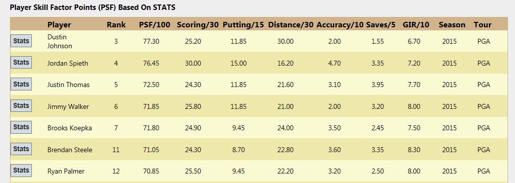 Each players skill factor (PSF) is determined by tallying up skill factor points based on how well the player performed for each skill factor category (accuracy, distance, gir, putting, saves, scoring). These categories are assigned weights of importance. By running these weights into the PGDA engine, the player ranking can be determined for those weights at the current point in time.